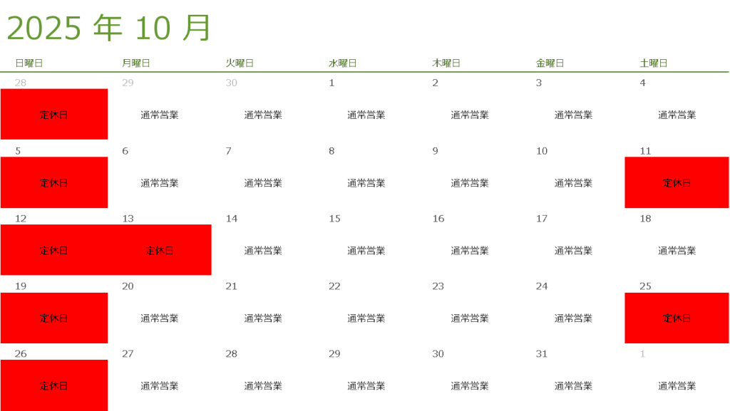 2025年10月1日 / 最終更新日 : 2025年10月1日 suzuki 今月の定休日 10月の定休日10月の定休日のお知らせです。従来通り日曜日、第2第4土曜日、13日は祝日の為お休みとさせて頂きます。宜しくお願いいたします。