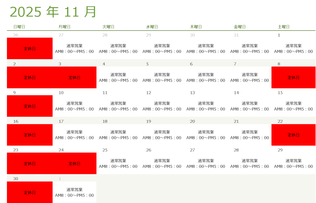 2025年11月4日 / 最終更新日 : 2025年11月4日 suzuki 今月の定休日 11月の定休日11月の定休日のお知らせです。従来通り日曜日、第2第4土曜日、3日(月)は祝日、24日(月)は振替休日の為お休みとさせて頂きます。宜しくお願いいたします。